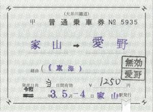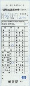 発行情報なし | 改札付近窓口の補充券です。JR線連絡でかつ、硬券が用意されていない駅までの乗車券は手書きで発売されます。なお、明智鉄道+JR線の合計距離が100kmを超える場合、JR線内で途中下車が可能になります。 |