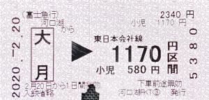 河口湖駅FKT③(窓処)発行のJR連絡券。河口湖~横浜線町田で発券。
