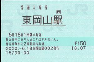 東岡山駅改札付近みどりの窓口発行の入場券です。