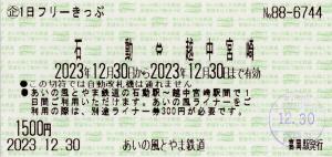 きっぷ売り場内、3つある窓口のうち左端の端末で発券したフリーきっぷ(全線版)です。