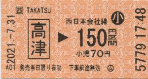 | 発行情報なし | | 高津駅の京都方踏切付近(福知山方面ホーム側)に設置の簡易券売機にて購入の乗車券です。 |