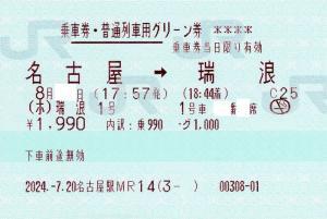ホームライナー瑞浪の指定席グリーン券です。