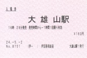 大雄山の改札口横にある出札窓口の感熱私鉄端末にて発行した入場券です。