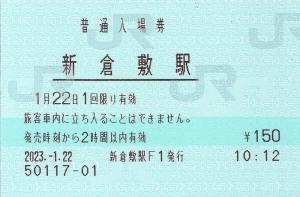 新倉敷駅改札付近みどりの窓口にて発行の入場券です。