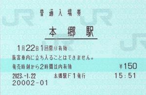 本郷駅改札付近みどりの窓口にて発行の入場券です。