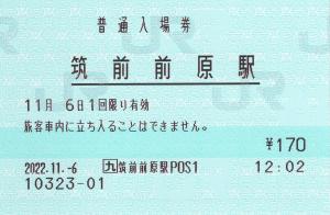 筑前前原駅改札付近みどりの窓口にて発行の入場券です。