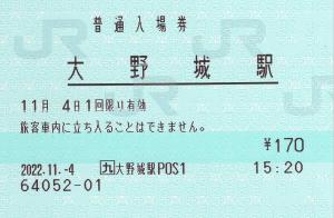 大野城駅改札付近のみどりの窓口にて発行の入場券です。