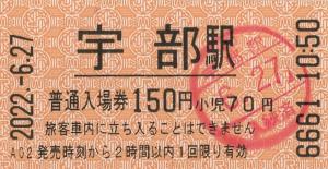 宇部駅切符売り場の向かって左側、自動券売機にて購入した入場券です。