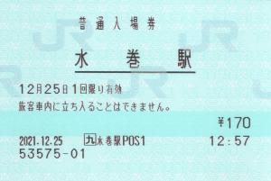 水巻駅改札付近のみどりの窓口発行の入場券です。