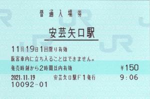 安芸矢口駅改札付近のみどりの窓口発行の入場券です。