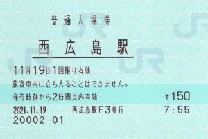 西広島駅北口改札付近券売機横にあるみどりの窓口発行の入場券です。