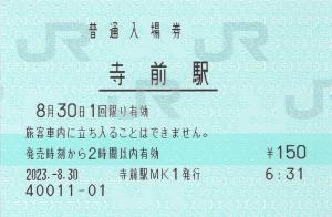 寺前駅改札付近のみどりの券売機にて発行の入場券です。