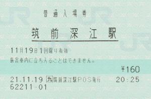 筑前深江駅改札付近の窓口にて発行の入場券です。