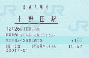小野田駅改札付近の指定席券売機にて発行の入場券です。