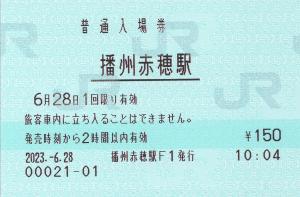播州赤穂駅改札付近のみどりの窓口にて発行の入場券です。