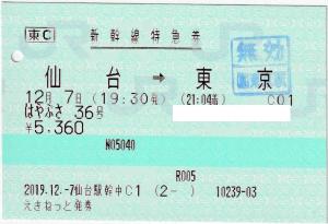 | 一般画面からの投稿(1791) 仙台駅(宮城県/JR東日本) 仙台駅幹中C1(MV35C) ・ 2019/12/07 新幹線 特急券 列車1(はやぶさ) 東C えきねっと/とれTEL 85mmロール 無効印(東京) |