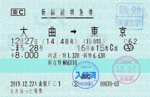 | 一般画面からの投稿(3152) 大曲駅(秋田県/JR東日本) 大曲駅FC1(MV50C) ・ 2019/12/27 新幹線 特急券 列車1(こまち) 東C えきねっと/とれTEL 85mmロール 入鋏印(大曲) 無効印(東京) |