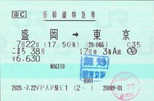 | 一般画面からの投稿(4239) びゅうプラザ八戸駅(青森県/JR東日本) VP八戸駅E1(ME4) ・ 2020/07/22 新幹線 特急券 列車1(こまち) 東C 85mmロール 入鋏印(盛岡) 無効印(東京) |