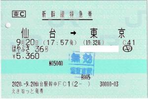 | 一般画面からの投稿(4658) 仙台駅(宮城県/JR東日本) 仙台駅幹中FC1(MV50C) ・ 2020/09/20 新幹線 特急券 列車1(はやぶさ) 東C えきねっと/とれTEL 85mmロール 無効印(東京) |