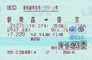 | 一般画面からの投稿(5743) 盛岡駅(岩手県/JR東日本) 盛岡駅E4(ME4) ・ 2021/02/27 新幹線 特急券 グリーン 列車1(はやぶさ) 東C 東-優4割53 乗変 85mmロール 無効印(東京) |