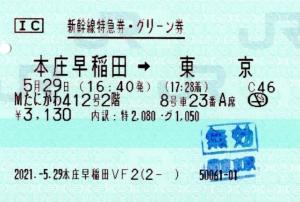 | 一般画面からの投稿(6372) 本庄早稲田駅(埼玉県/JR東日本) 本庄早稲田VF2(MV50) ・ 2021/05/29 新幹線 特急券 グリーン 列車1(Maxたにがわ) IC 85mmロール 無効印(東京) |