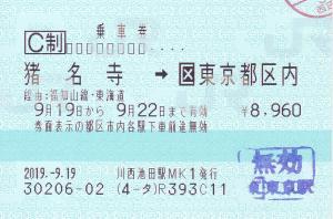 | 一般画面からの投稿(104) 猪名寺駅(兵庫県/JR西日本) 猪名寺駅MK1(MV50) ・ 2019/09/13 特急券 B寝台 個室 列車1(サンライズ出雲ソロ) C制 JR西日本5489サービス 120mmロール 無効印(東京) |