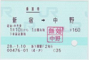 | 一般画面からの投稿(3580) 東京駅(東京都/JR東日本) 東京駅VF46(MV50) ・ 2016/09/04 片道 東C 85mmロール 無効印(中野) |
