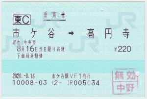 | 一般画面からの投稿(4419) 市ケ谷駅(東京都/JR東日本) 市ケ谷駅VF1(MV50) ・ 2020/08/16 片道 東C 85mmロール 無効印(中野) |