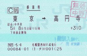 | 一般画面からの投稿(8000) 札幌駅(北海道/JR北海道) 札幌駅西MR4(MR52) ・ 2022/05/04 片道 C制 85mmロール 無効印(中野) |
