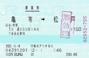 | 一般画面からの投稿(5559) JTB亀有アリオ店(東京都/JTB) (交)亀有アリオ(感熱旅行業端末) ・ 2021/01/04 片道 85mmプリカット 無効印(松戸) |