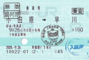 | 一般画面からの投稿(4733) 古河駅(茨城県/JR東日本) 古河駅F1(MR52) ・ 2020/09/26 片道 乗変 85mmロール 無効印(湯河原) 乗車記念印(湯河原) |
