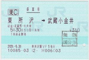 | 一般画面からの投稿(3434) 東所沢駅(埼玉県/JR東日本) 東所沢駅VF1(MV50) ・ 2020/05/30 片道 東C 85mmロール 無効印(国分寺) |