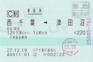 | 一般画面からの投稿(3282) びゅうプラザ千葉駅(千葉県/JR東日本) VP千葉R4(感熱旅行業端末) ・ 2015/12/19 片道 C制 85mmプリカット 入鋏印(西千葉) 無効印(津田沼) |