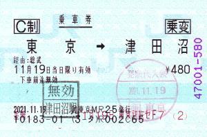 | 一般画面からの投稿(7316) JR東海ツアーズ東京支店(東京都/JR東海) (JT)東京MR25(MR51) ・ 2021/11/19 片道 C制 乗変 85mmプリカット 発駅代入鋏(東京) 無効印(津田沼) |