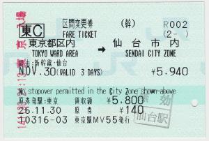 | 一般画面からの投稿(3684) 東京駅(東京都/JR東日本) 東京駅MV55(MV30) ・ 2014/11/30 区間変更(片道) 東C 英語表記 85mmロール 無効印(仙台) |
