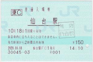 | 一般画面からの投稿(4859) 仙台駅(宮城県/JR東日本) 仙台駅FC1(MV50C) ・ 2020/10/18 普通入場券 東C 85mmロール 無効印(仙台) |