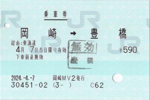 | 一般画面からの投稿(10001) 岡崎駅(愛知県/JR東海) 岡崎MV2(MV50) ・ 2024/04/07 片道 85mmロール 無効印(豊橋) |