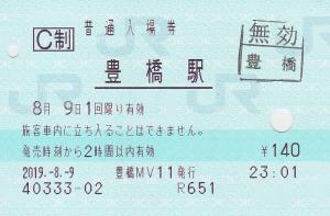 | 一般画面からの投稿(114) 豊橋駅(愛知県/JR東海) 豊橋MV11(MV50) ・ 2019/08/09 普通入場券 C制 85mmロール 無効印(豊橋) |