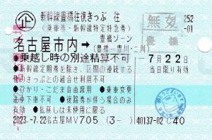 | 一般画面からの投稿(9729) 名古屋駅(愛知県/JR東海) 名古屋MV705(MV50) ・ 2023/07/22 本券(企252-01:新幹線豊橋往復きっぷ) 85mmロール 無効印(豊橋) |