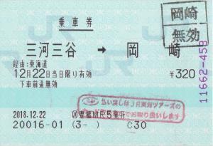 | 一般画面からの投稿(834) JR東海ツアーズ豊橋支店(愛知県/JR東海) (JT)豊橋MR5(MR51) ・ 2018/12/22 片道 C制 85mmプリカット 無効印(岡崎) |
