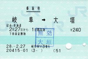 | 一般画面からの投稿(3913) 岐阜駅(岐阜県/JR東海) 岐阜MV3(MV35) ・ 2016/02/27 片道 85mmロール 無効印(大垣) |