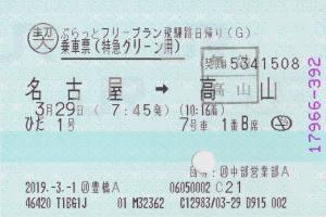 | 一般画面からの投稿(4209) JR東海ツアーズ豊橋支店(愛知県/JR東海) (JT)豊橋A(感熱旅行業端末) ・ 2019/03/01 特急券 グリーン 列車1(ひだ) 契約乗車票 85mmプリカット 無効印(高山) |