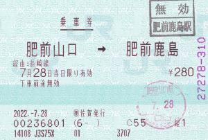| 一般画面からの投稿(8201) 東武トップツアーズ佐賀支店(佐賀県/東武トップツアーズ) (東)佐賀(感熱旅行業端末) ・ 2022/07/28 片道 口座発売 85mmプリカット 入鋏印(江北) 無効印(肥前鹿島) |