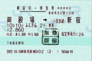 | 一般画面からの投稿(7048) 御殿場駅(静岡県/JR東海) 御殿場駅MR002(MR52) ・ 2021/10/10 片道 特急券 席無 85mmロール 無効印(新宿) |