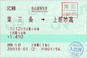 | 一般画面からの投稿(2355) 吉田駅(新潟県/JR東日本) 吉田駅E1(ME4) ・ 2020/01/12 自由席特急券 C制 85mmロール 無効印(上越妙高) |