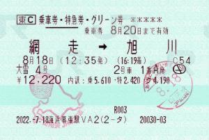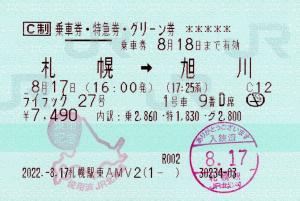 | 一般画面からの投稿(8260) 札幌駅(北海道/JR北海道) 札幌駅東AMV2(MV50) ・ 2022/08/17 片道 特急券 グリーン 列車1(ライラック) C制 85mmロール 入鋏印(札幌) 乗車記念印(旭川) |