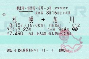 | 一般画面からの投稿(9216) 札幌駅(北海道/JR北海道) 札幌駅東MV1(MV50) ・ 2023/08/15 片道 特急券 グリーン 列車1(ライラック) 85mmロール 乗車記念印(旭川) |