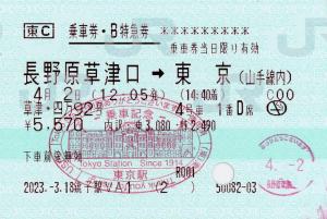 | きっぷアルバム(---/公開) 銚子駅(千葉県/JR東日本) 銚子駅VA1(MV50) ・ 2023/03/18 片道 在来線B 特急券 列車1(草津・四万) 東C 85mmロール 入鋏印(長野原草津口) 乗車記念印(東京) |