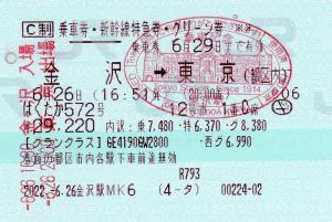 | 一般画面からの投稿(8096) 金沢駅(石川県/JR西日本) 金沢駅MK6(MV50) ・ 2022/06/26 片道 新幹線 特急券 P/DXグリーン/GC 列車1(はくたか) C制 85mmロール 乗車記念印(東京) |
