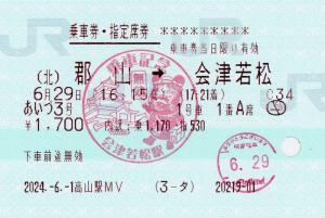 | きっぷアルバム(---/公開) 高山駅(岐阜県/JR東海) 高山駅MV(MV50) ・ 2024/06/01 片道 指定席券 列車1(あいづ) 85mmロール 入鋏印(郡山) 乗車記念印(会津若松) |